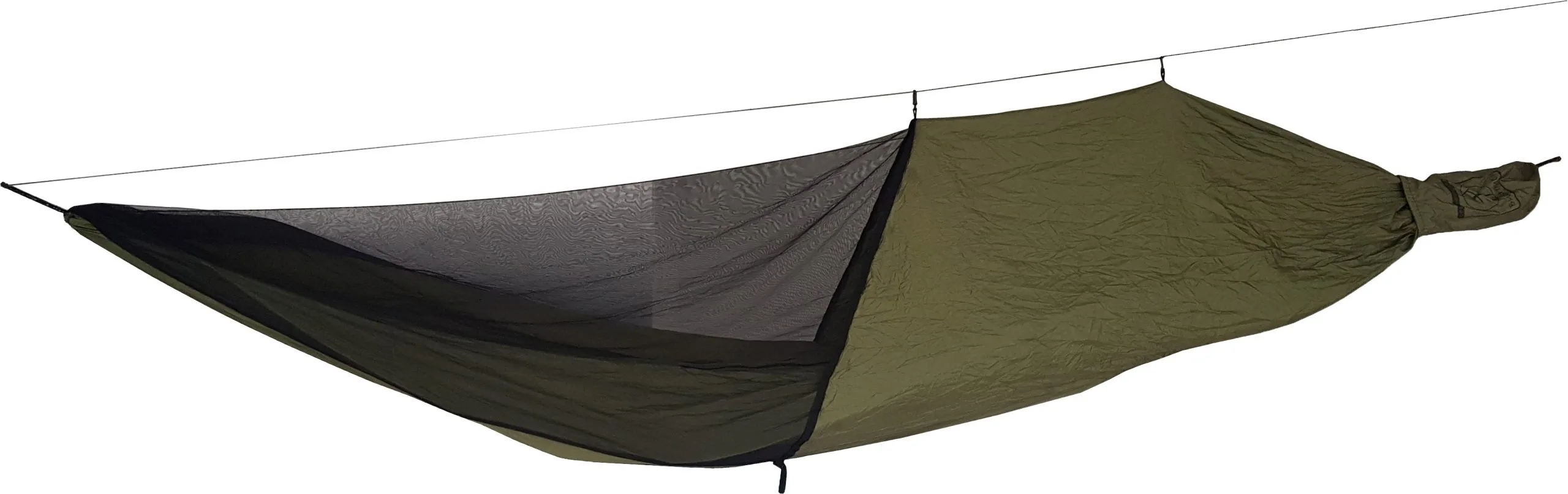 Nemt og hurtigt kan du vippe myggenettet lidt op og skabe et vindue mellem myggenettet og hængekøjen, hvis du lige skal se dig omkring eller række ud efter noget uden for hængekøjen. Ved at lukke lynlåsen i fodenden af hængekøjen kan du flytte selve myggenettet op over dit hoved, så du har mulighed for at ligge og beundre stjernerne, uden at blive forstyrret af irriterende insekter. Hermed vil resten af ​​kroppen af kroppen være dækket af selve hængekøjematerialet, hvilket skaber den karakteristiske kokonfacon. Denne lynlås udgør ca. 2/3 af hængekøjens længde fra fødderne til hovedet.